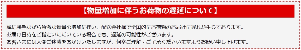銀行振込を除き、通常はご注文日から5日以内に 発送致します。 但し、在庫が当店に無い場合や、 日・祝日をはさむ場合は、発送までに多少お時間が かかる場合がございます。 詳しくは当店からの 受注確認メールにてご確認下さい。
